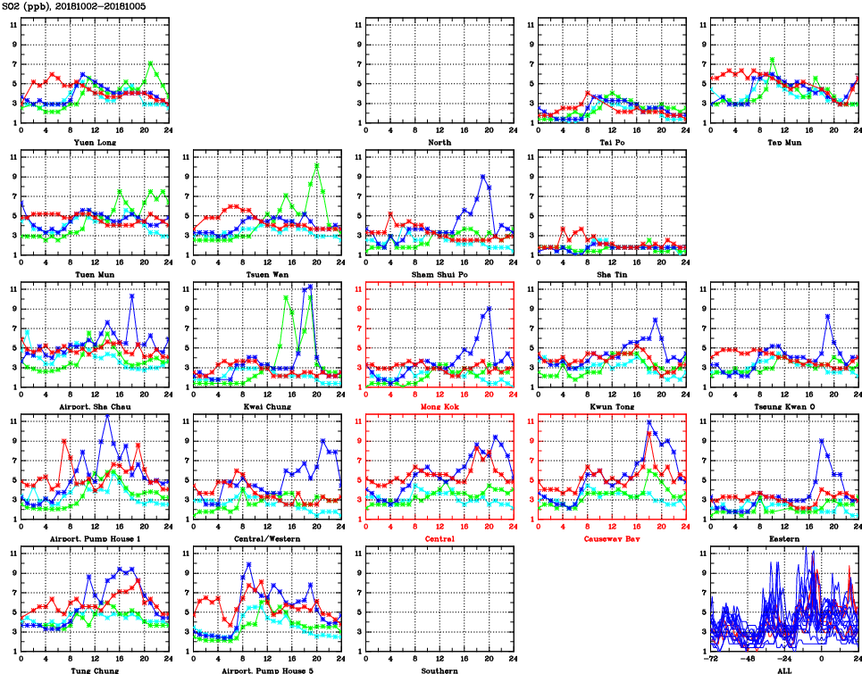 | Air Quality Data Time Series for SO2 (2018/10/05) | ( Line colors: Day -3 Day -2 Day -1 Current day ) | 2D Map Current AQHI |