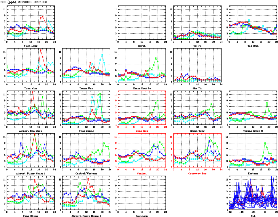 | Air Quality Data Time Series for SO2 (2018/10/06) | ( Line colors: Day -3 Day -2 Day -1 Current day ) | 2D Map Current AQHI |