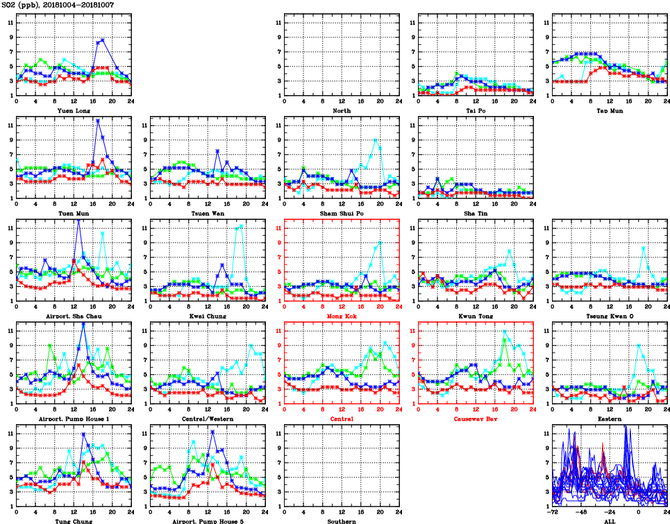 | Air Quality Data Time Series for SO2 (2018/10/07) | ( Line colors: Day -3 Day -2 Day -1 Current day ) | 2D Map Current AQHI |