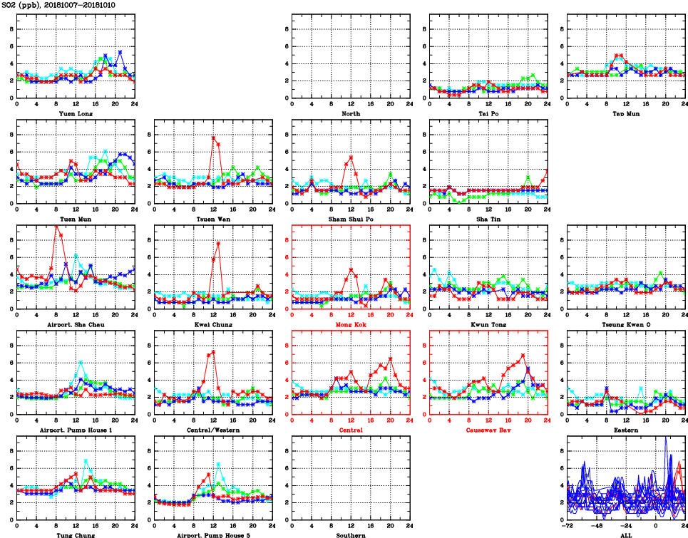 | Air Quality Data Time Series for SO2 (2018/10/10) | ( Line colors: Day -3 Day -2 Day -1 Current day ) | 2D Map Current AQHI |