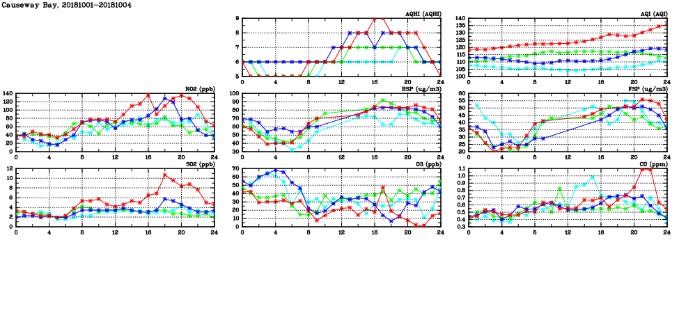 | Air Quality Data Time Series in Causeway Bay (2018/10/04) | ( Line colors: Day -3 Day -2 Day -1 Current day ) | 2D Map Current AQHI |