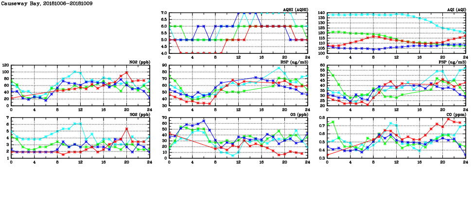 | Air Quality Data Time Series in Causeway Bay (2018/10/09) | ( Line colors: Day -3 Day -2 Day -1 Current day ) | 2D Map Current AQHI |