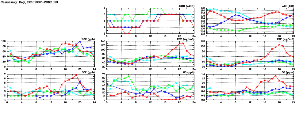 | Air Quality Data Time Series in Causeway Bay (2018/10/10) | ( Line colors: Day -3 Day -2 Day -1 Current day ) | 2D Map Current AQHI |