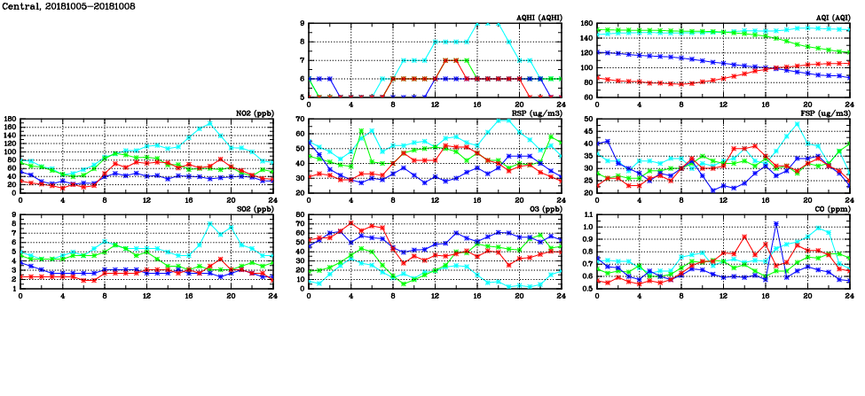 | Air Quality Data Time Series in Central (2018/10/08) | ( Line colors: Day -3 Day -2 Day -1 Current day ) | 2D Map Current AQHI |