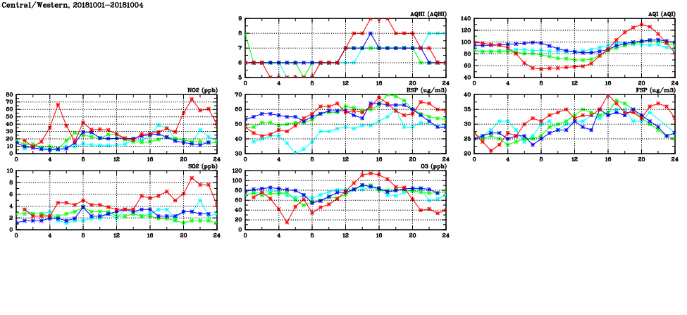 | Air Quality Data Time Series in Central/Western (2018/10/04) | ( Line colors: Day -3 Day -2 Day -1 Current day ) | 2D Map Current AQHI |