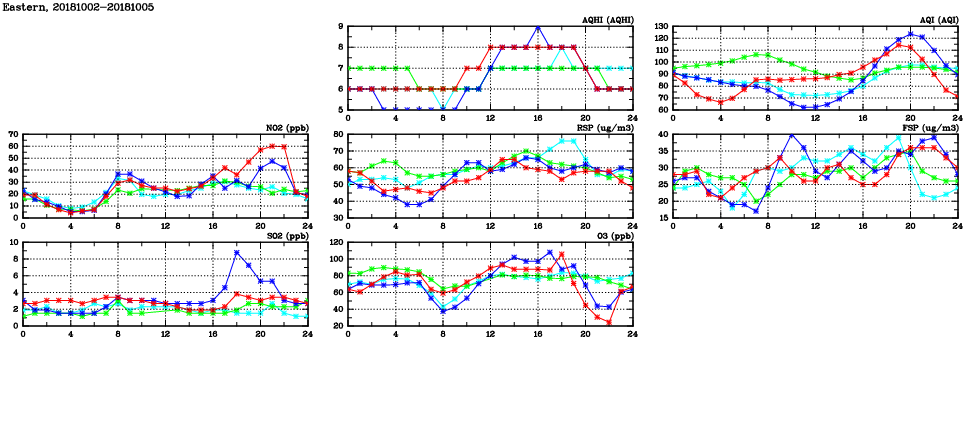 | Air Quality Data Time Series in Eastern (2018/10/05) | ( Line colors: Day -3 Day -2 Day -1 Current day ) | 2D Map Current AQHI |
