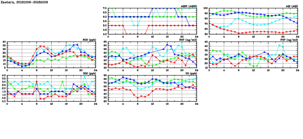 | Air Quality Data Time Series in Eastern (2018/10/09) | ( Line colors: Day -3 Day -2 Day -1 Current day ) | 2D Map Current AQHI |