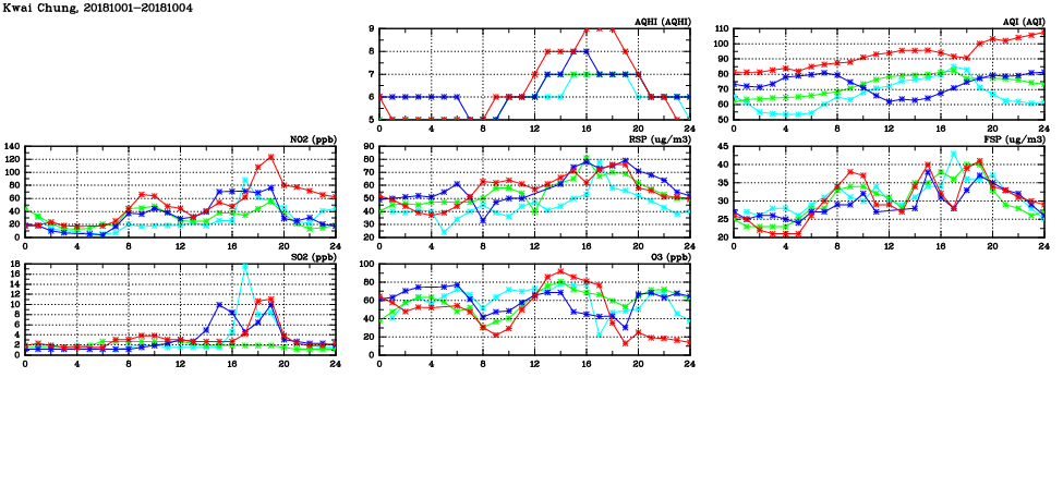 | Air Quality Data Time Series in Kwai Chung (2018/10/04) | ( Line colors: Day -3 Day -2 Day -1 Current day ) | 2D Map Current AQHI |