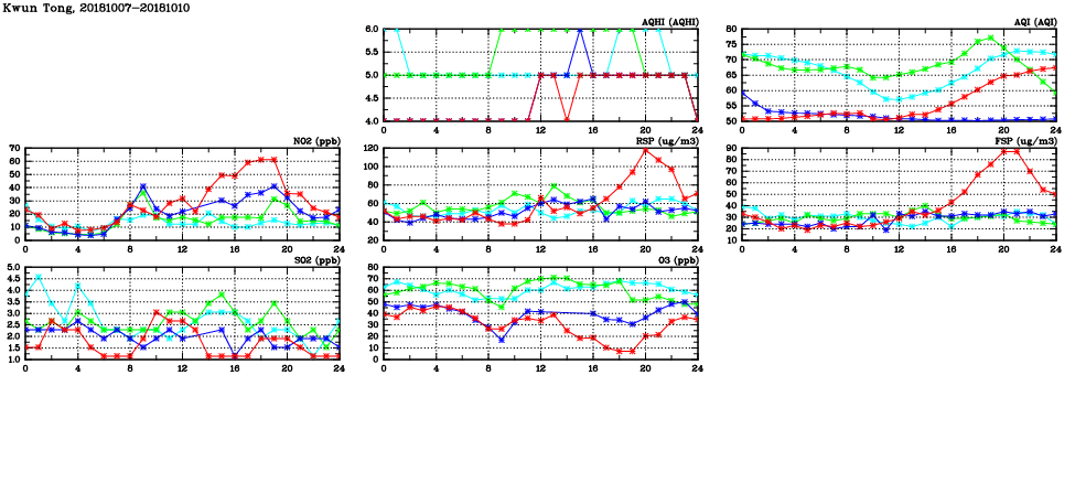 | Air Quality Data Time Series in Kwun Tong (2018/10/10) | ( Line colors: Day -3 Day -2 Day -1 Current day ) | 2D Map Current AQHI |