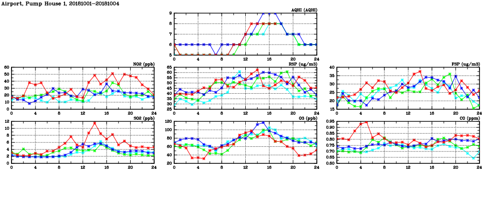 | Air Quality Data Time Series in Airport, Pump House 1 (2018/10/04) | ( Line colors: Day -3 Day -2 Day -1 Current day ) | 2D Map Current AQHI |