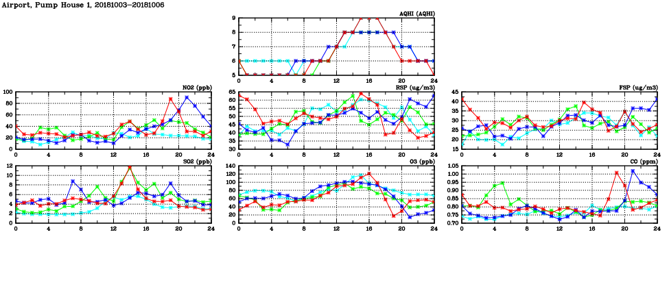 | Air Quality Data Time Series in Airport, Pump House 1 (2018/10/06) | ( Line colors: Day -3 Day -2 Day -1 Current day ) | 2D Map Current AQHI |