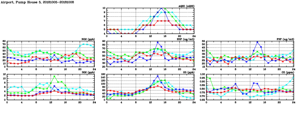 | Air Quality Data Time Series in Airport, Pump House 5 (2018/10/08) | ( Line colors: Day -3 Day -2 Day -1 Current day ) | 2D Map Current AQHI |