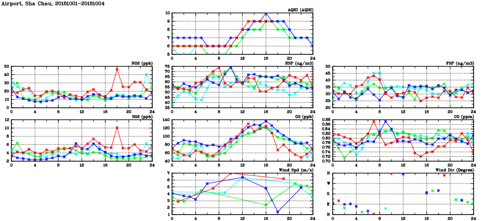 | Air Quality Data Time Series in Airport, Sha Chau (2018/10/04) | ( Line colors: Day -3 Day -2 Day -1 Current day ) | 2D Map Current AQHI |