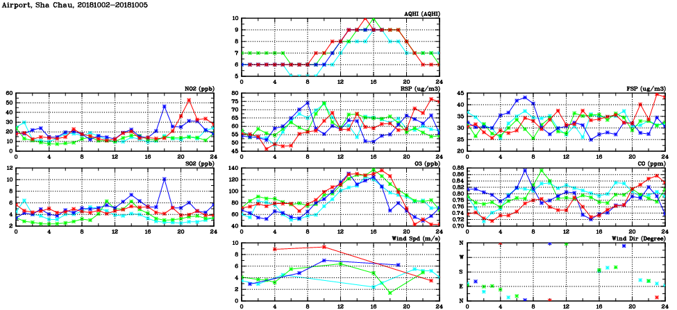 | Air Quality Data Time Series in Airport, Sha Chau (2018/10/05) | ( Line colors: Day -3 Day -2 Day -1 Current day ) | 2D Map Current AQHI |