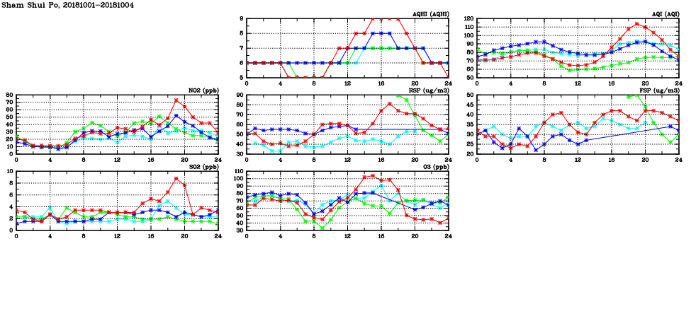 | Air Quality Data Time Series in Sham Shui Po (2018/10/04) | ( Line colors: Day -3 Day -2 Day -1 Current day ) | 2D Map Current AQHI |