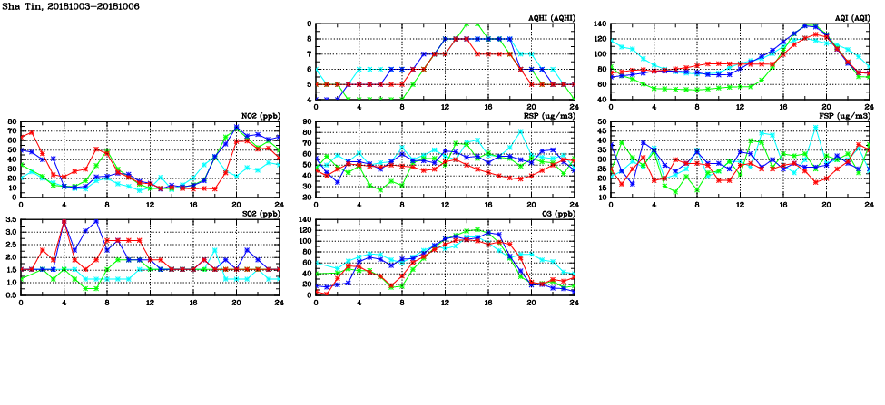 | Air Quality Data Time Series in Sha Tin (2018/10/06) | ( Line colors: Day -3 Day -2 Day -1 Current day ) | 2D Map Current AQHI |