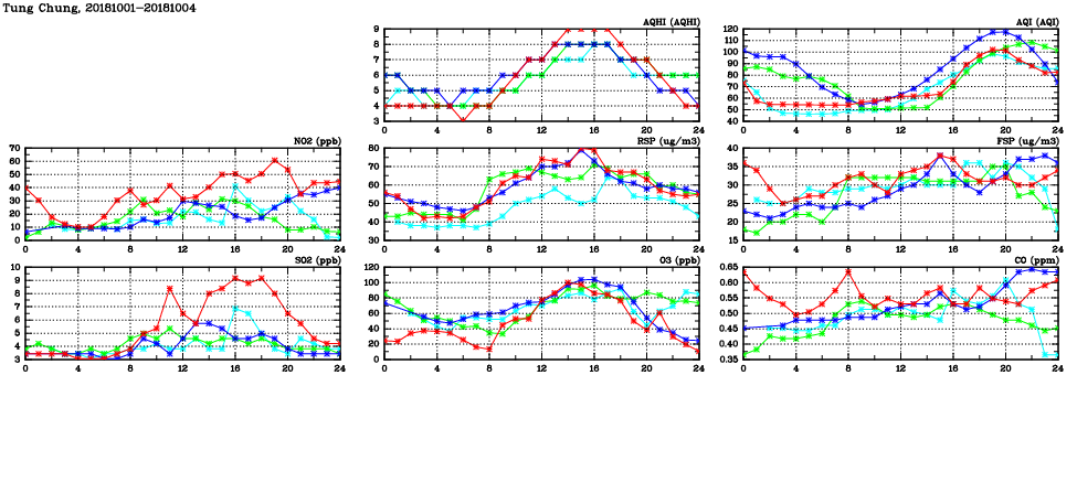 | Air Quality Data Time Series in Tung Chung (2018/10/04) | ( Line colors: Day -3 Day -2 Day -1 Current day ) | 2D Map Current AQHI |