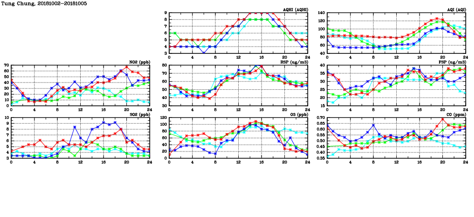 | Air Quality Data Time Series in Tung Chung (2018/10/05) | ( Line colors: Day -3 Day -2 Day -1 Current day ) | 2D Map Current AQHI |