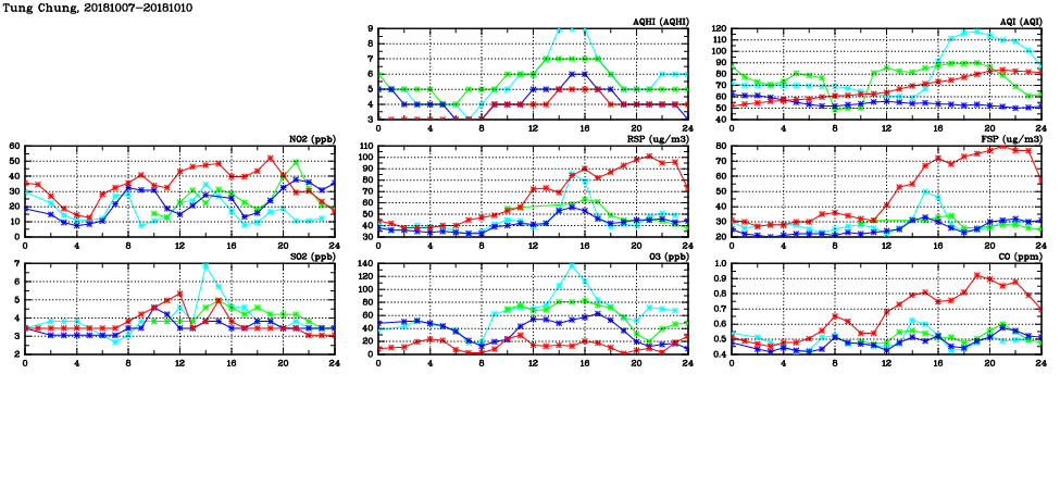 | Air Quality Data Time Series in Tung Chung (2018/10/10) | ( Line colors: Day -3 Day -2 Day -1 Current day ) | 2D Map Current AQHI |