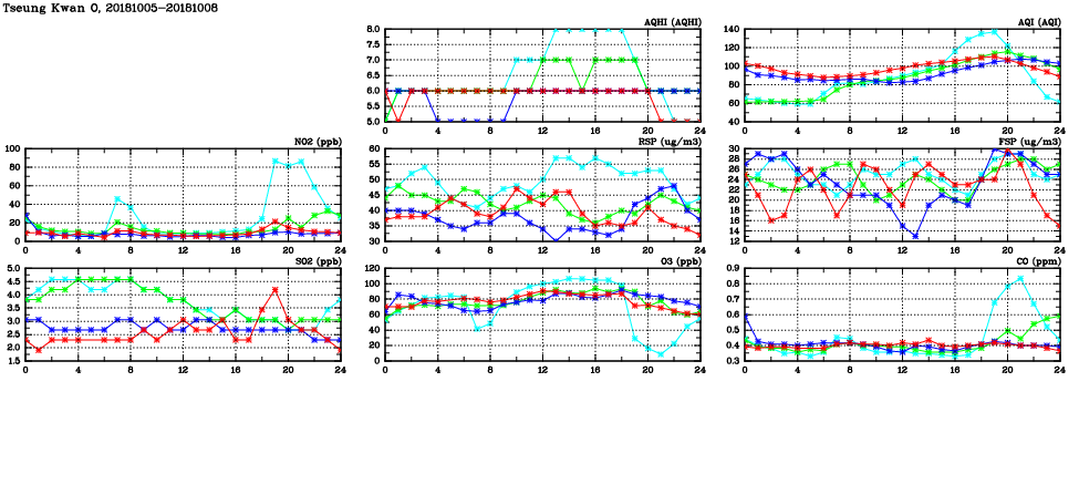 | Air Quality Data Time Series in Tseung Kwan O (2018/10/08) | ( Line colors: Day -3 Day -2 Day -1 Current day ) | 2D Map Current AQHI |