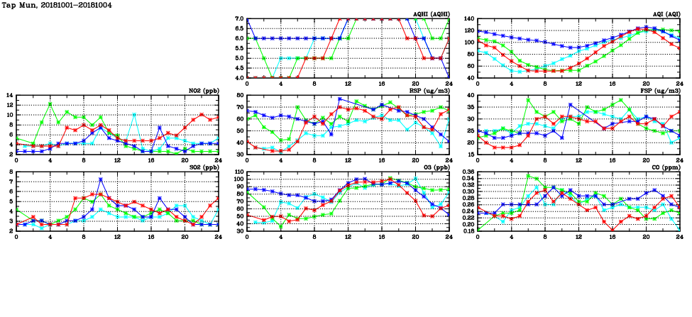 | Air Quality Data Time Series in Tap Mun (2018/10/04) | ( Line colors: Day -3 Day -2 Day -1 Current day ) | 2D Map Current AQHI |