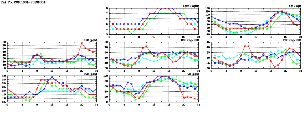 | Air Quality Data Time Series in Tai Po (2018/10/04) | ( Line colors: Day -3 Day -2 Day -1 Current day ) | 2D Map Current AQHI |