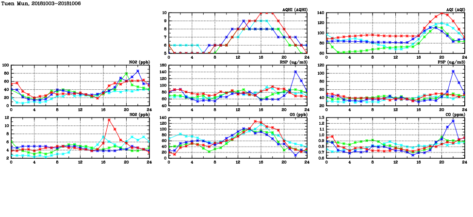 | Air Quality Data Time Series in Tuen Mun (2018/10/06) | ( Line colors: Day -3 Day -2 Day -1 Current day ) | 2D Map Current AQHI |