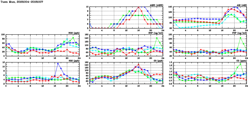 | Air Quality Data Time Series in Tuen Mun (2018/10/07) | ( Line colors: Day -3 Day -2 Day -1 Current day ) | 2D Map Current AQHI |