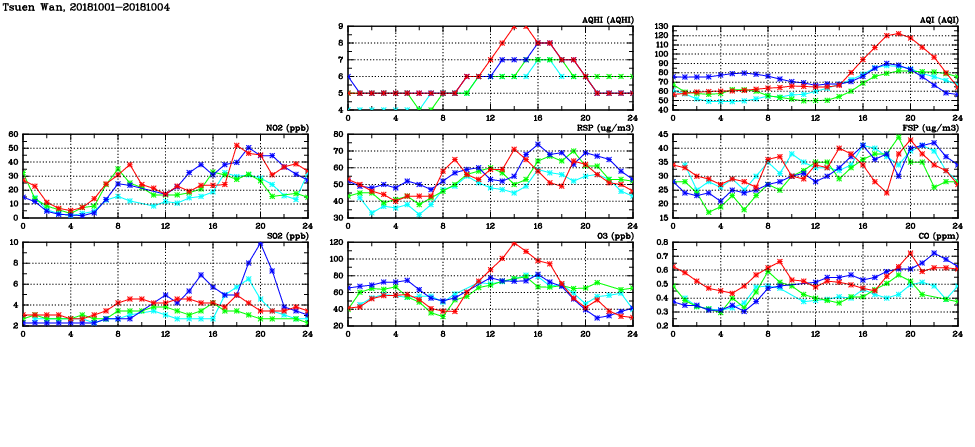 | Air Quality Data Time Series in Tsuen Wan (2018/10/04) | ( Line colors: Day -3 Day -2 Day -1 Current day ) | 2D Map Current AQHI |