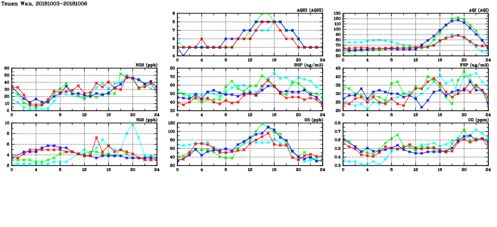 | Air Quality Data Time Series in Tsuen Wan (2018/10/06) | ( Line colors: Day -3 Day -2 Day -1 Current day ) | 2D Map Current AQHI |
