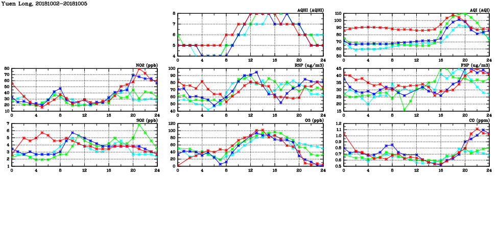 | Air Quality Data Time Series in Yuen Long (2018/10/05) | ( Line colors: Day -3 Day -2 Day -1 Current day ) | 2D Map Current AQHI |