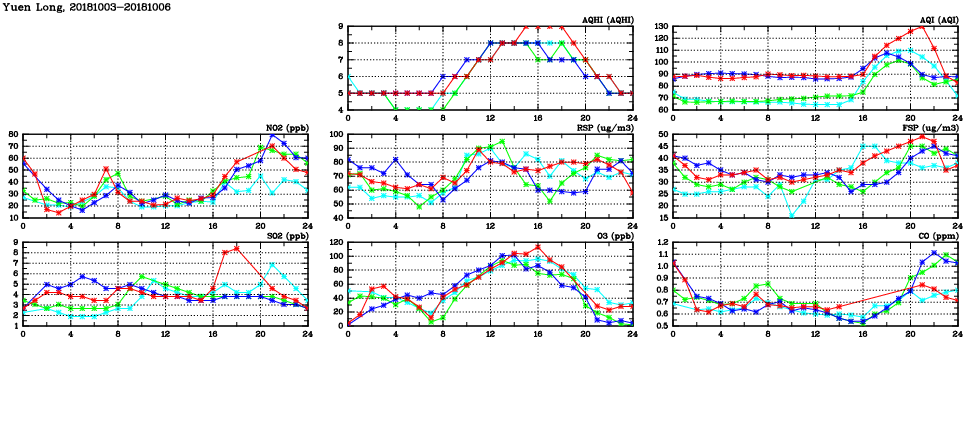 | Air Quality Data Time Series in Yuen Long (2018/10/06) | ( Line colors: Day -3 Day -2 Day -1 Current day ) | 2D Map Current AQHI |