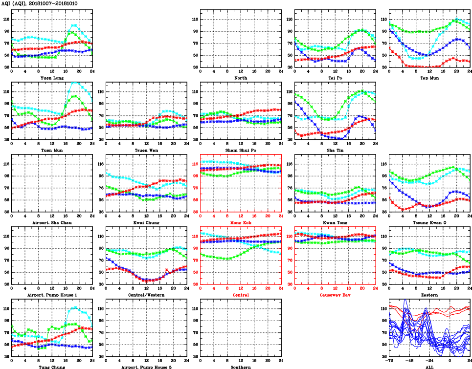 | Air Quality Data Time Series for AQI (2018/10/10) | ( Line colors: Day -3 Day -2 Day -1 Current day ) | 2D Map Current AQHI |