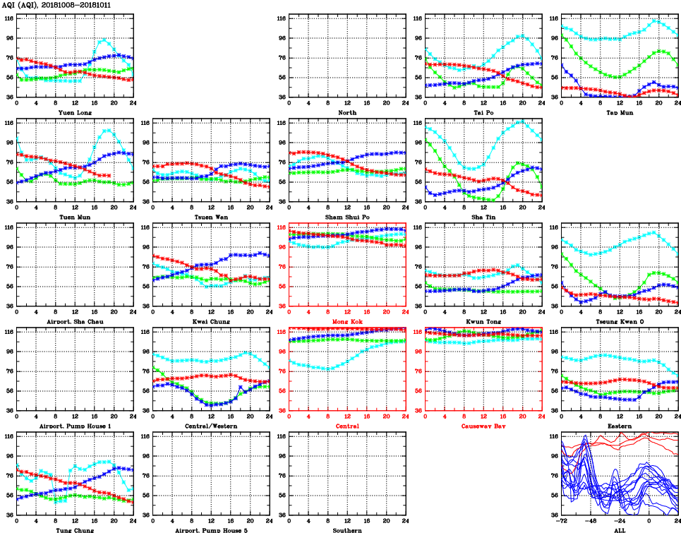 | Air Quality Data Time Series for AQI (2018/10/11) | ( Line colors: Day -3 Day -2 Day -1 Current day ) | 2D Map Current AQHI |