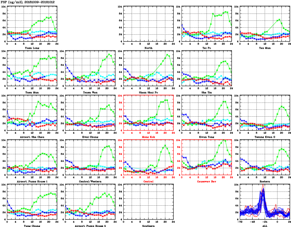 | Air Quality Data Time Series for FSP (2018/10/12) | ( Line colors: Day -3 Day -2 Day -1 Current day ) | 2D Map Current AQHI |