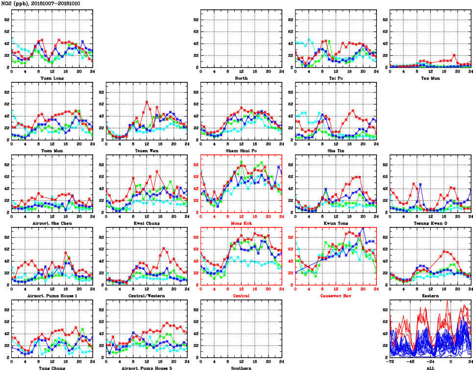 | Air Quality Data Time Series for NO2 (2018/10/10) | ( Line colors: Day -3 Day -2 Day -1 Current day ) | 2D Map Current AQHI |