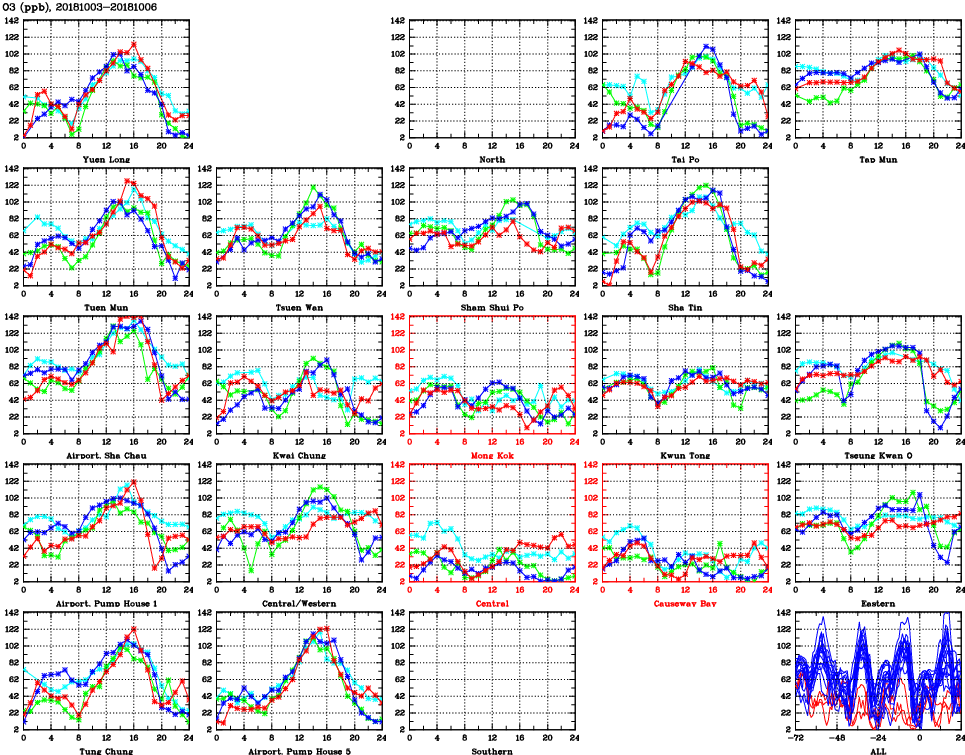 | Air Quality Data Time Series for O3 (2018/10/06) | ( Line colors: Day -3 Day -2 Day -1 Current day ) | 2D Map Current AQHI |