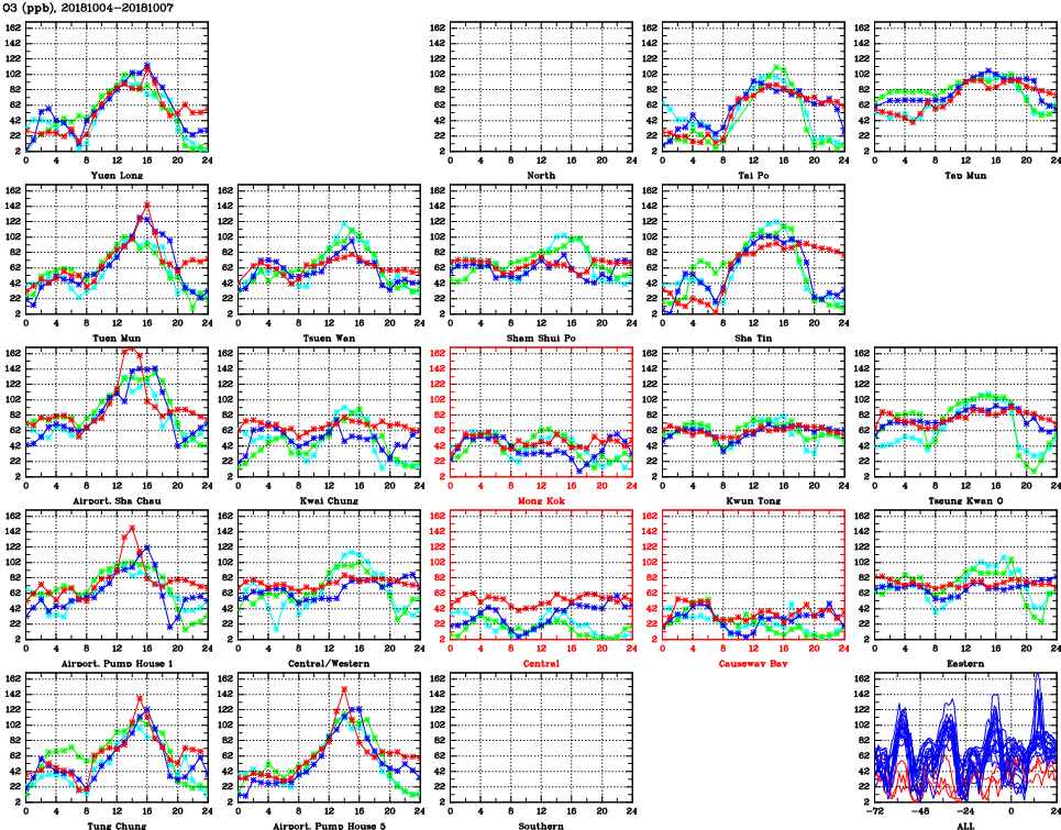 | Air Quality Data Time Series for O3 (2018/10/07) | ( Line colors: Day -3 Day -2 Day -1 Current day ) | 2D Map Current AQHI |