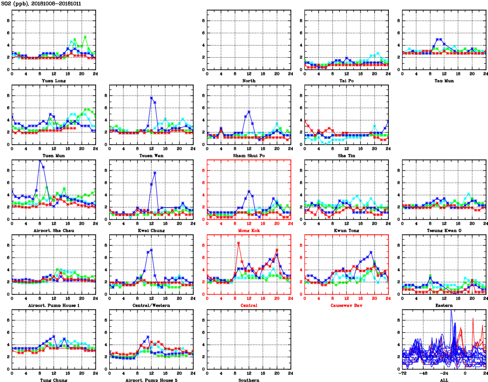 | Air Quality Data Time Series for SO2 (2018/10/11) | ( Line colors: Day -3 Day -2 Day -1 Current day ) | 2D Map Current AQHI |