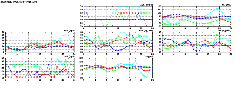 | Air Quality Data Time Series in Eastern (2018/10/08) | ( Line colors: Day -3 Day -2 Day -1 Current day ) | 2D Map Current AQHI |