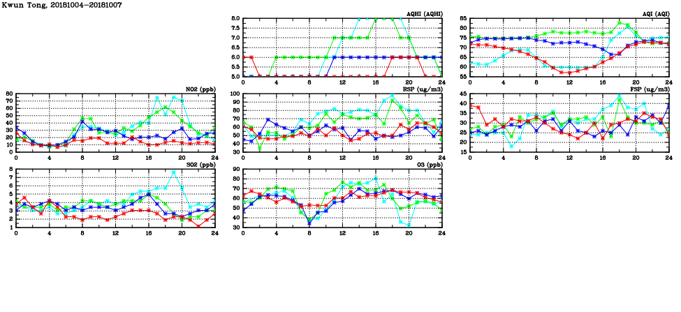 | Air Quality Data Time Series in Kwun Tong (2018/10/07) | ( Line colors: Day -3 Day -2 Day -1 Current day ) | 2D Map Current AQHI |