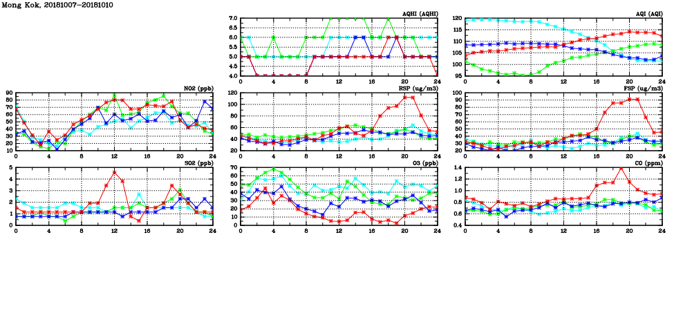 | Air Quality Data Time Series in Mong Kok (2018/10/10) | ( Line colors: Day -3 Day -2 Day -1 Current day ) | 2D Map Current AQHI |