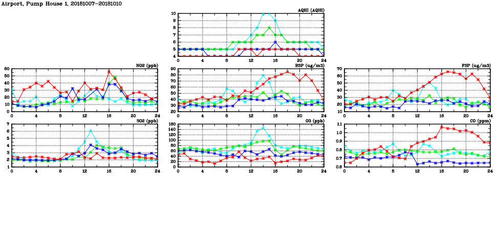 | Air Quality Data Time Series in Airport, Pump House 1 (2018/10/10) | ( Line colors: Day -3 Day -2 Day -1 Current day ) | 2D Map Current AQHI |