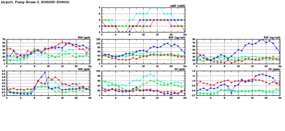 | Air Quality Data Time Series in Airport, Pump House 5 (2018/10/11) | ( Line colors: Day -3 Day -2 Day -1 Current day ) | 2D Map Current AQHI |