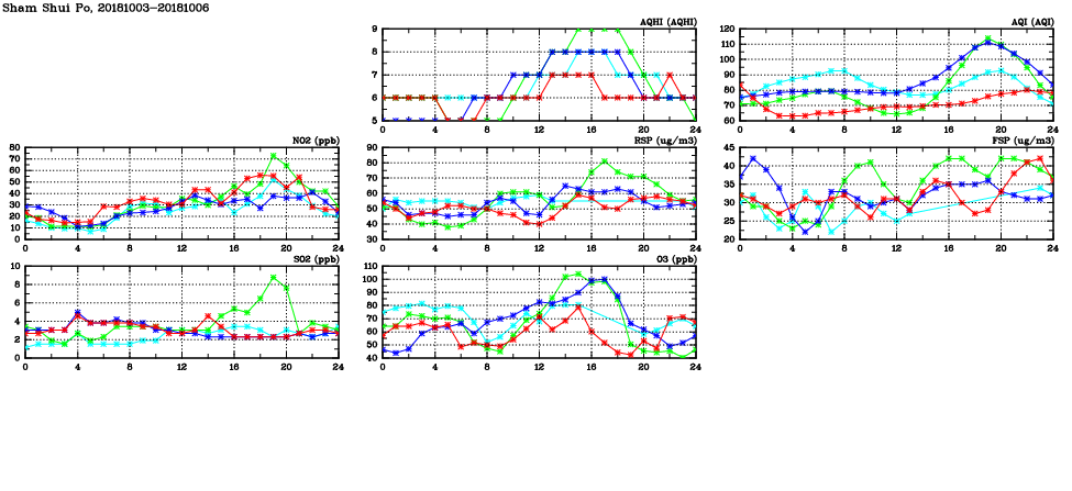 | Air Quality Data Time Series in Sham Shui Po (2018/10/06) | ( Line colors: Day -3 Day -2 Day -1 Current day ) | 2D Map Current AQHI |