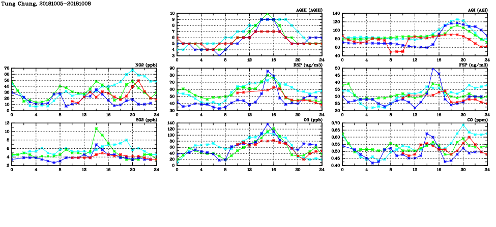 | Air Quality Data Time Series in Tung Chung (2018/10/08) | ( Line colors: Day -3 Day -2 Day -1 Current day ) | 2D Map Current AQHI |