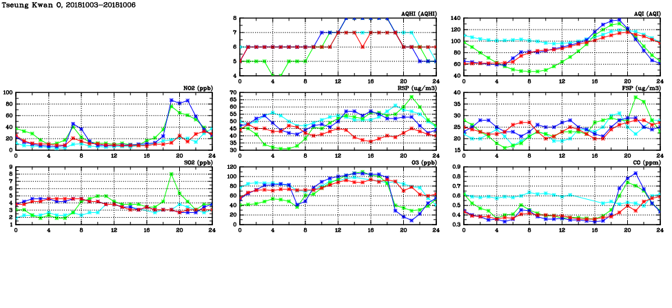 | Air Quality Data Time Series in Tseung Kwan O (2018/10/06) | ( Line colors: Day -3 Day -2 Day -1 Current day ) | 2D Map Current AQHI |
