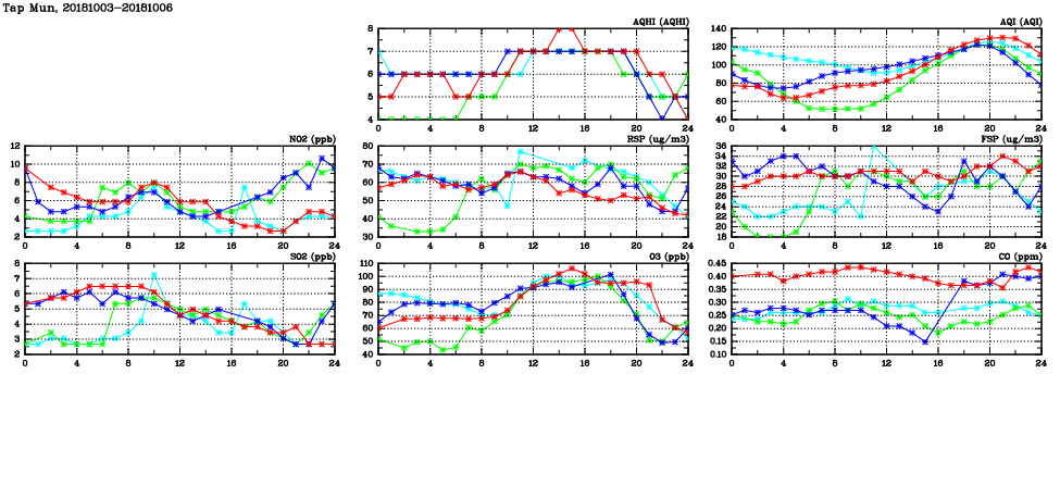 | Air Quality Data Time Series in Tap Mun (2018/10/06) | ( Line colors: Day -3 Day -2 Day -1 Current day ) | 2D Map Current AQHI |