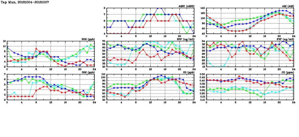 | Air Quality Data Time Series in Tap Mun (2018/10/07) | ( Line colors: Day -3 Day -2 Day -1 Current day ) | 2D Map Current AQHI |