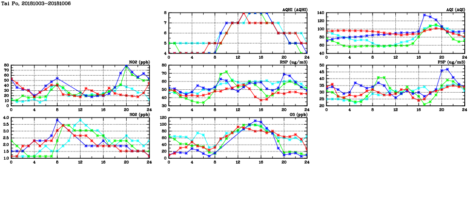 | Air Quality Data Time Series in Tai Po (2018/10/06) | ( Line colors: Day -3 Day -2 Day -1 Current day ) | 2D Map Current AQHI |